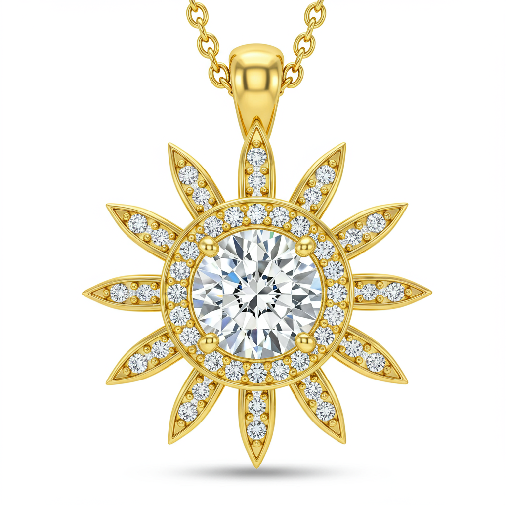 This exquisite Sun Necklace captures the radiant warmth of the midday star. Crafted in luminous 18KT yellow gold, the pendant features a brilliant center stone surrounded by a delicate halo of meticulously set pave diamonds, symbolizing endless energy and light. Its design is timeless yet modern, providing a breathtaking statement piece for any occasion. Suspended from a slender chain, this necklace elevates everyday luxury with unparalleled sparkle and grace.