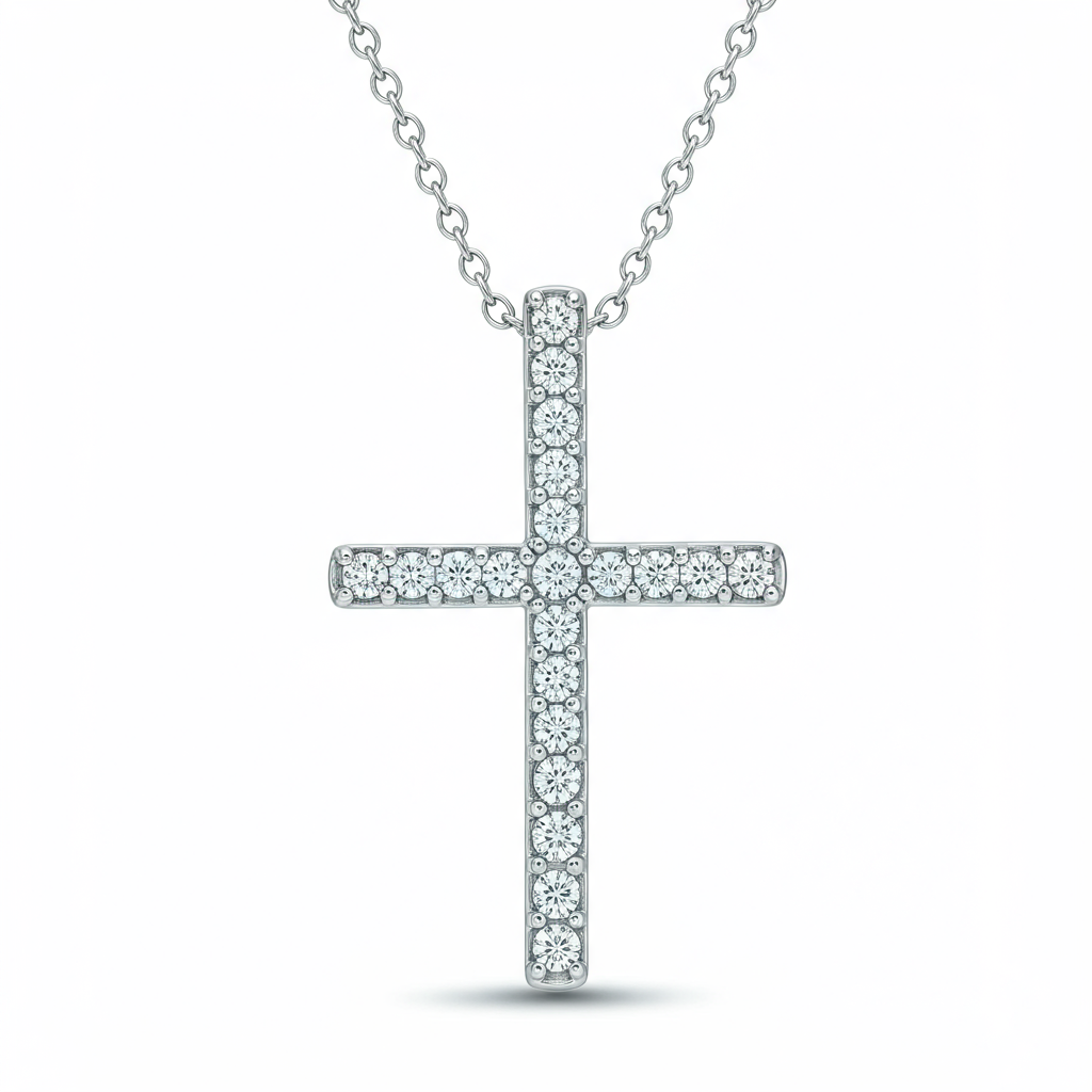 The Tiffany Cross Necklace embodies timeless elegance and spiritual grace. Crafted meticulously in lustrous 18KT white gold, the delicate cross pendant features an array of brilliant VVS diamonds set to maximize light return. Suspended from a slender matching chain, this piece offers sophisticated simplicity perfect for everyday wear or as a meaningful gift. Its classic design ensures it remains a cherished heirloom for generations.