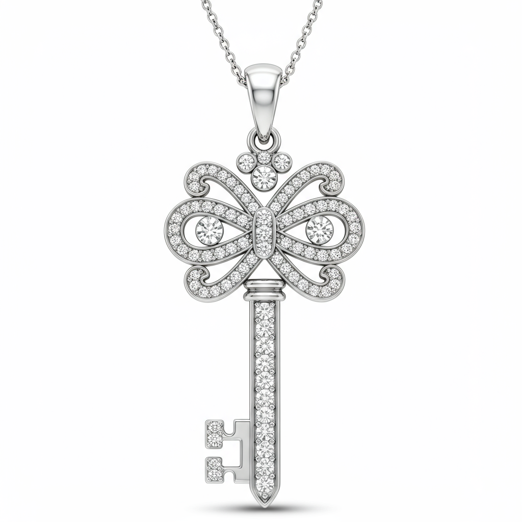 The iconic Tiffany Key Necklace embodies empowerment and unlocking new possibilities, rendered here in brilliant 18KT white gold. This masterfully crafted pendant features a classic key silhouette completely covered in micro-pave set, VVS clarity diamonds, capturing breathtaking sparkle from every angle. Suspended from an elegant chain, this piece serves as a timeless emblem of luxury and sophistication. It is the perfect signature accessory for daily wear or formal occasions, symbolizing hope and freedom.