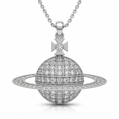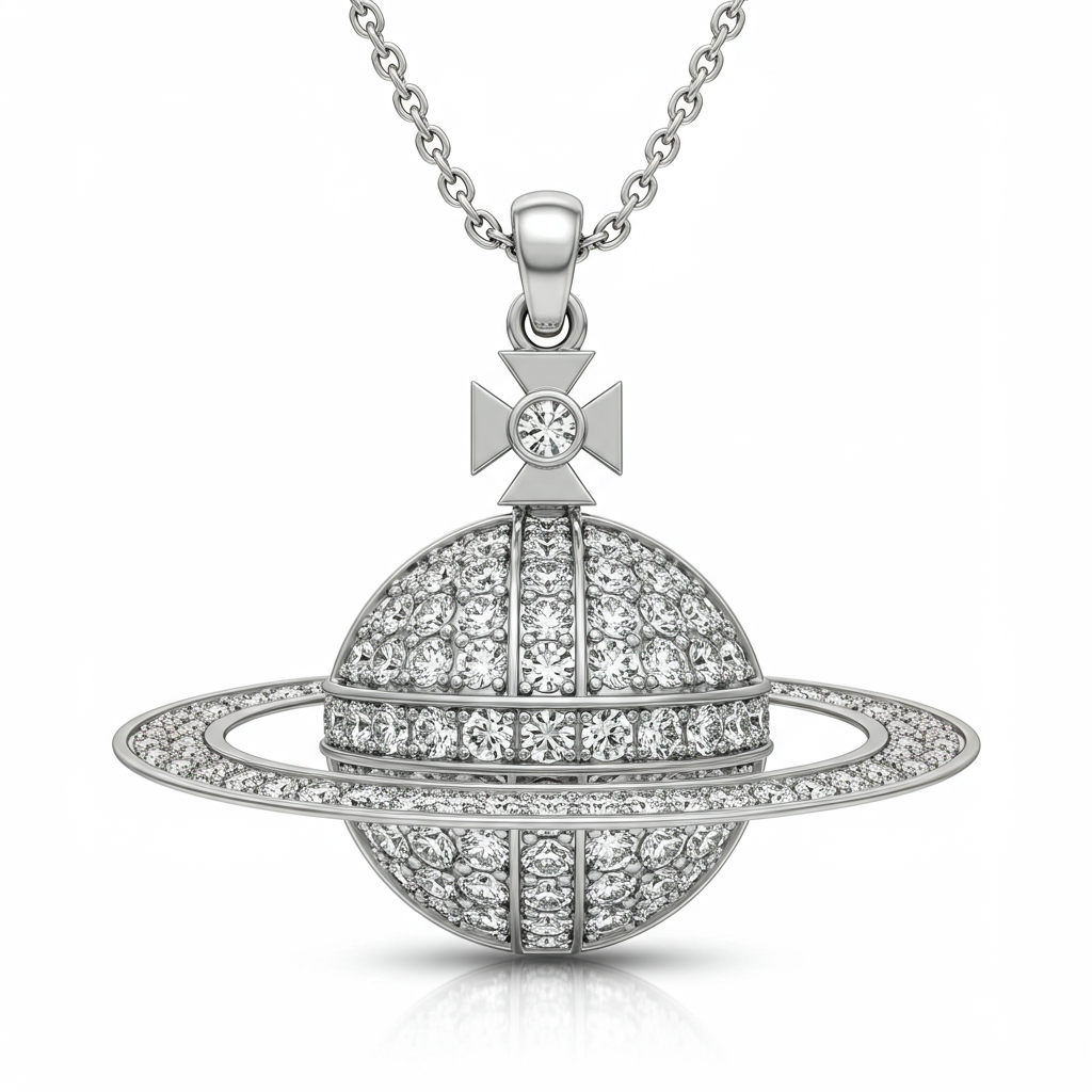 The iconic Vivienne Westwood Orb Necklace captures rebellious elegance and cosmic inspiration in a definitive designer piece. Crafted in luminous 18KT white gold, the signature Saturn design features meticulous micro-pave settings across its detailed rings. This sophisticated statement accessory uses brilliant VVS diamonds, perfectly balancing punk-rock heritage with the finest high-jewelry refinement. It is the definitive piece for the fashion-forward connoisseur seeking unmistakable style.