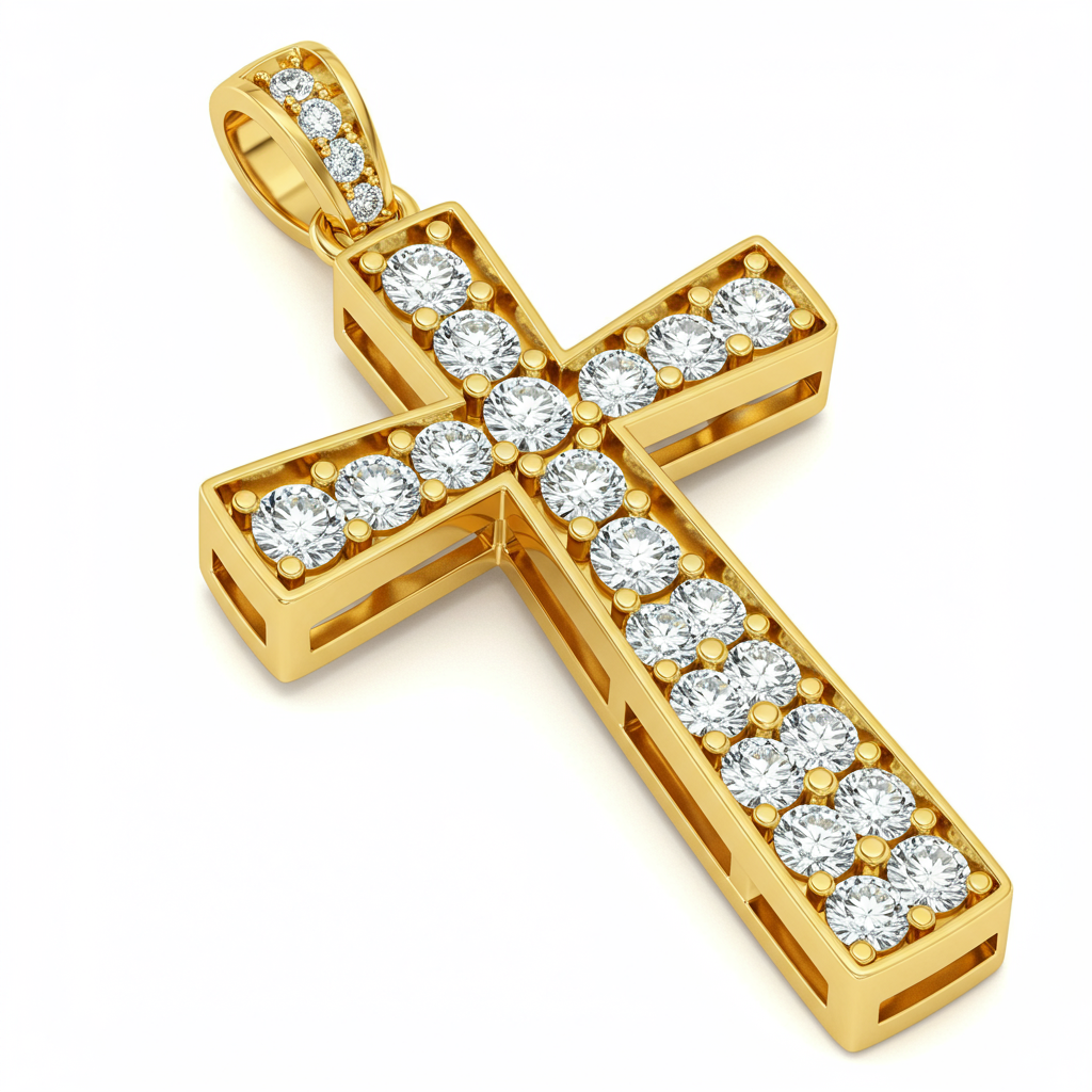 The Womens Gold Cross Necklace is a timeless symbol of faith rendered in exquisite 18KT yellow gold. This elegant pendant features a delicate pave setting, meticulously adorned with brilliant round-cut diamonds. Its refined silhouette hangs gracefully from a fine cable chain, making it perfect for daily wear or layering. This piece seamlessly blends spiritual meaning with high-end jewelry design, offering lasting elegance and breathtaking brilliance.