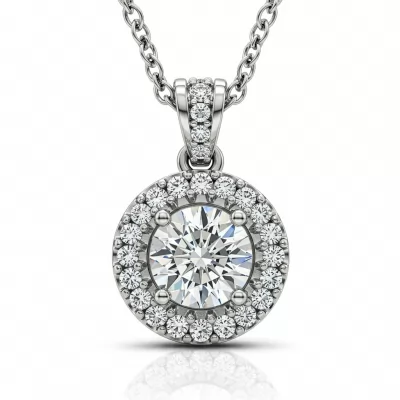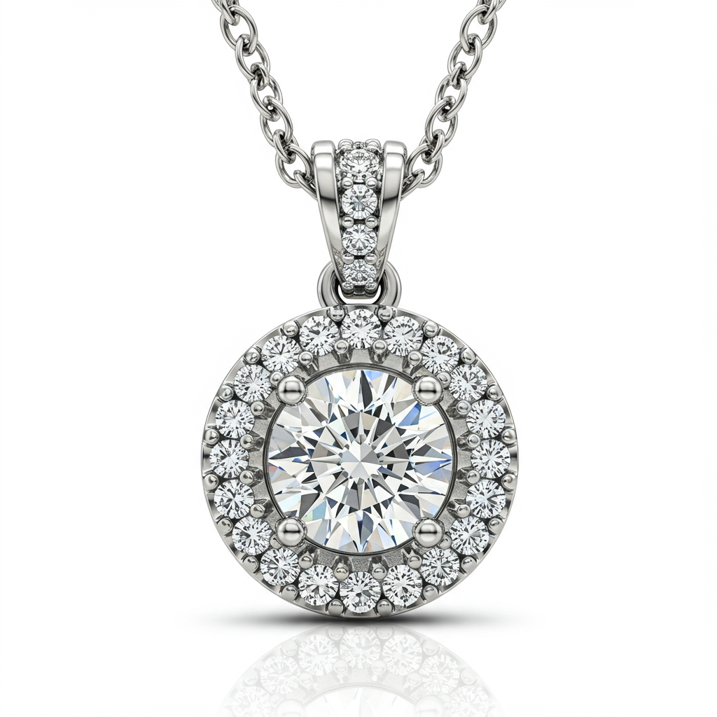 A contemporary masterpiece, the Ariana Grande Necklace captures eternal sophistication with its exquisite diamond halo design. A brilliant 1.50 carat round diamond, held securely in a refined prong setting, forms the breathtaking centerpiece. This magnificent diamond is encircled by a sparkling micro-pave halo, maximizing brilliance and ensuring luminosity from every angle. Crafted in radiant 18KT white gold, this necklace is the ultimate statement piece, designed for those who appreciate unparalleled luxury and modern elegance.