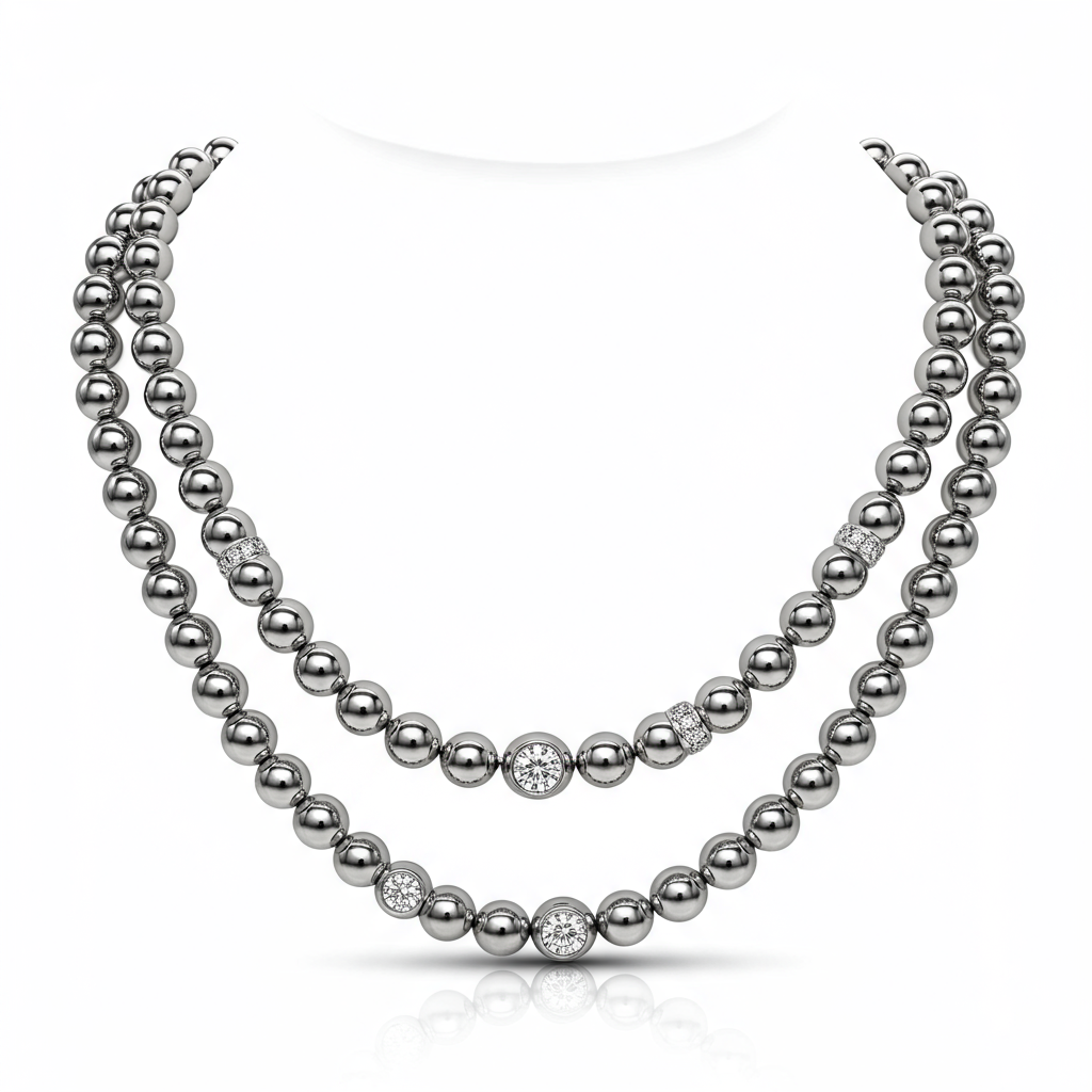 The Beads Necklace is a masterpiece of modern refinement, featuring a continuous string of expertly crafted precious metal beads interspersed with brilliant diamond accents. Each bead reflects light beautifully, creating a fluid, shimmering drape around the wearer's neck. Handcrafted in luminous 18KT white gold, this piece offers versatile elegance suitable for both gala events and sophisticated daily wear. It embodies subtle luxury and exceptional craftsmanship.