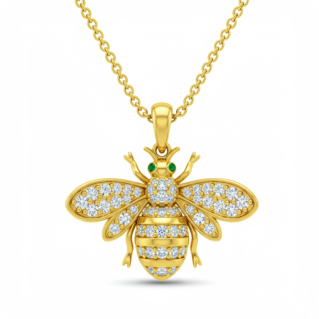The Bee Necklace is an exquisite tribute to nature's industrious spirit, expertly crafted in luminous 18KT yellow gold. The delicate bee motif features pavé-set VVS diamonds that capture and reflect light with dazzling brilliance, illuminating its intricate golden wings. Two vibrant natural emeralds serve as the bee's eyes, adding a captivating pop of color and depth. This sophisticated piece hangs gracefully from an adjustable chain, making it a stunning statement of personalized elegance and luxury.