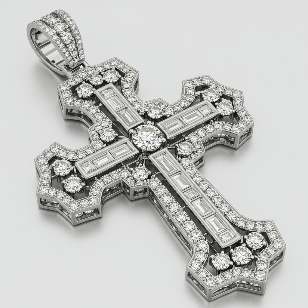 The Big Cross Necklace is a profound statement piece, meticulously crafted in enduring 18KT white gold. This significant pendant is completely blanketed in brilliant-cut pave diamonds, creating an intense, uninterrupted field of sparkle and luxury. Its bold, structured form symbolizes enduring faith and exceptional commitment to quality craftsmanship. This heirloom-quality piece is designed to be worn daily, offering both spiritual meaning and sophisticated elegance.