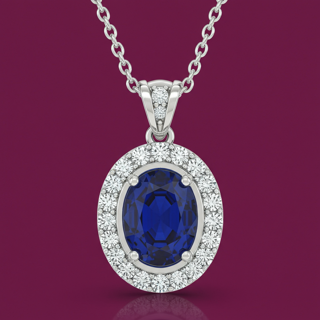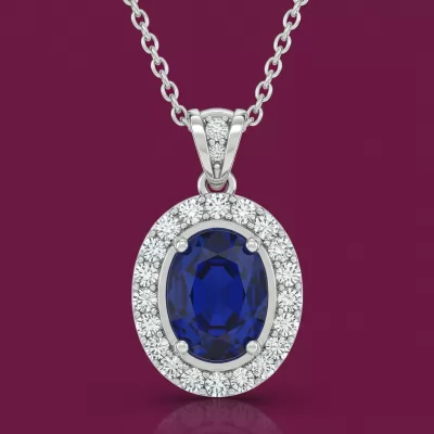 This exquisite Blue Sapphire Necklace features a mesmerizing 1.50 carat oval-cut sapphire, radiating deep royal blue hues. The central stone is encircled by a dazzling halo of VVS round brilliant diamonds, enhancing its magnificent presence. Set in luxurious 18KT white gold, the delicate chain ensures the pendant rests perfectly at the neckline. This piece epitomizes timeless elegance and serves as a spectacular statement accessory for any grand occasion.