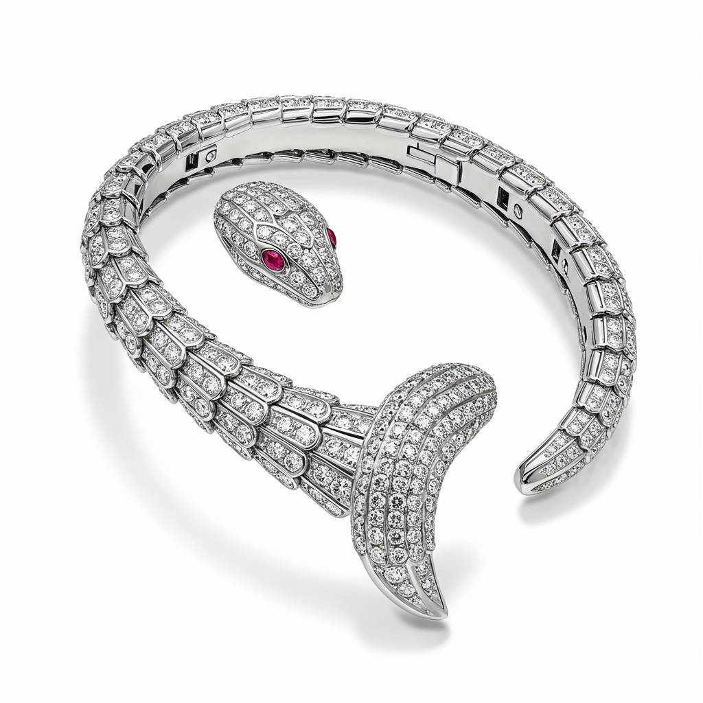 The Bulgari Serpenti Necklace is a masterpiece of fluid design, capturing the seductive movement of a serpent. Crafted in radiant 18KT white gold, this iconic collar wraps elegantly around the neck, symbolizing transformation and everlasting renewal. The serpentine body is meticulously pave-set with hundreds of brilliant-cut diamonds, creating a mesmerizing tapestry of light. This piece represents the pinnacle of high jewelry artistry, offering a dramatic and luxurious statement for the discerning collector.