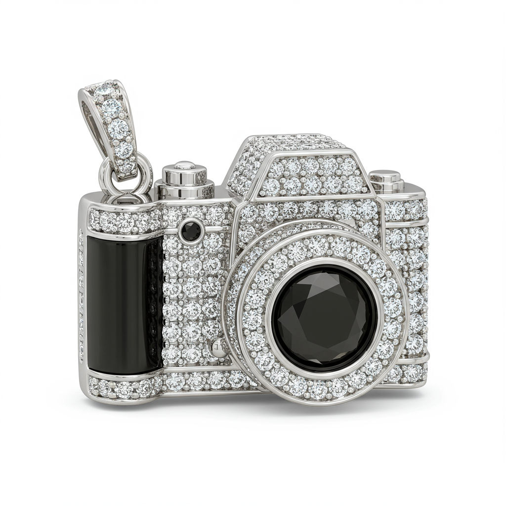 The Camera Necklace is a miniature masterpiece, capturing the essence of memory and artistry in wearable form. Crafted in radiant 18KT white gold, the detailed pendant features micro-pave diamonds meticulously lining the lens and frame structure. This unique charm serves as a perfect talisman for photographers, travelers, or anyone cherishing life's fleeting moments. It hangs gracefully on a delicate, adjustable chain, offering modern elegance and profound sentimental value.