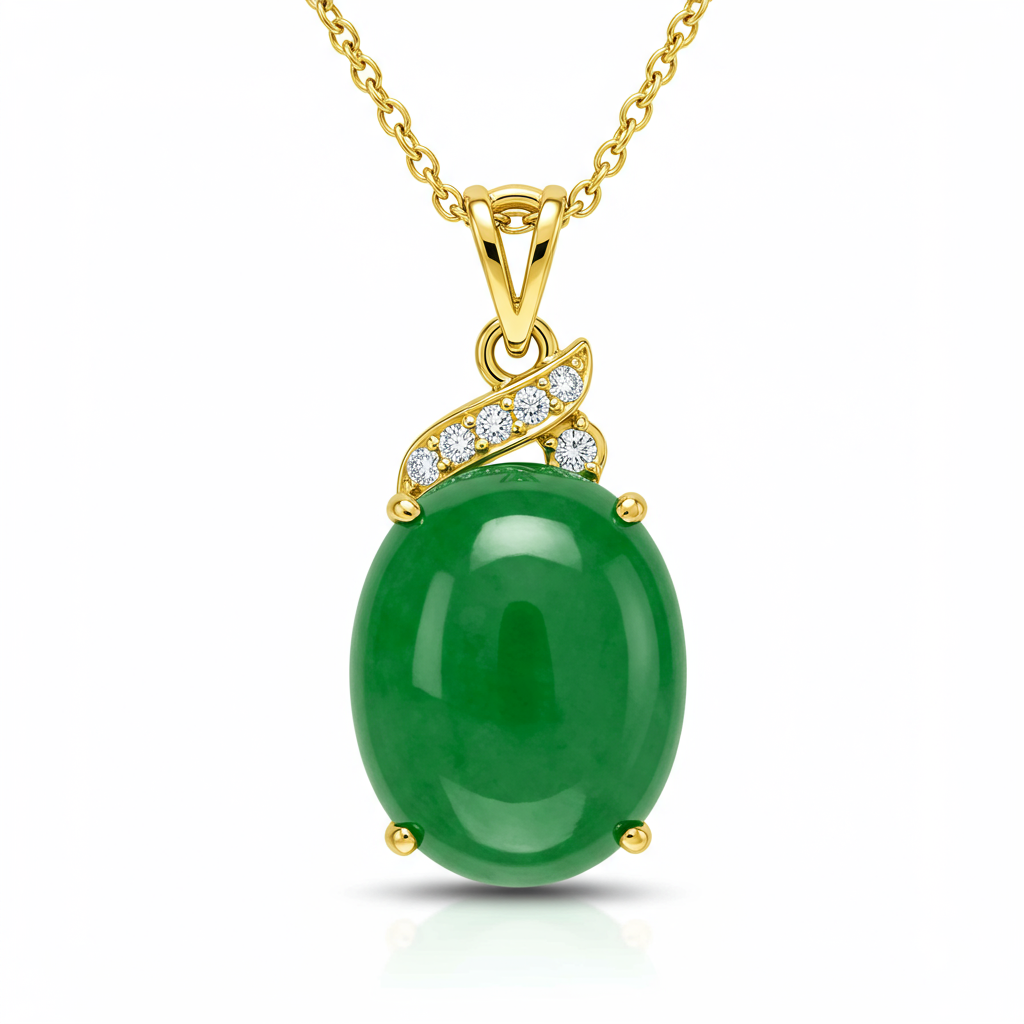 The Can Anyone Wear A Jade Necklace is a symbol of timeless elegance and protective harmony. Featuring a perfectly polished, natural Type A Burmese Jadeite cabochon, this pendant is suspended gracefully from a delicate 18KT yellow gold chain. The bezel setting is subtly accented with high-quality VVS diamonds, adding a brilliant contrast to the deep emerald hue of the jade. This universally flattering design offers both spiritual grounding and sophisticated luxury, making it an essential piece for any collection.