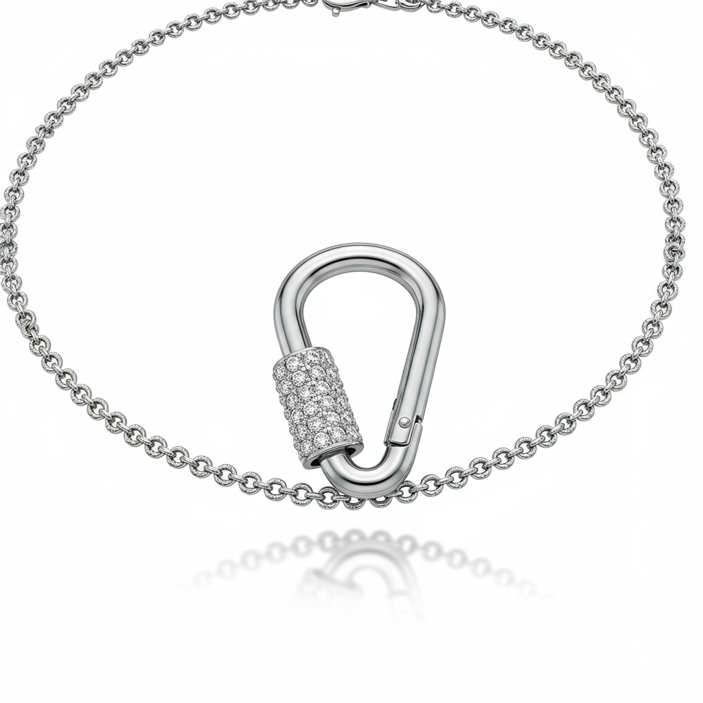 The Carabiner Necklace blends industrial strength with luxury, featuring a functional, yet exquisitely detailed carabiner clasp that serves as the centerpiece. Crafted in sleek 18KT white gold, the clasp is meticulously paved with brilliant VVS diamonds, catching light from every angle. This modern, versatile piece can be worn alone or layered, offering a bold statement of contemporary elegance. Its innovative design ensures both security and effortless style, redefining everyday luxury jewelry.