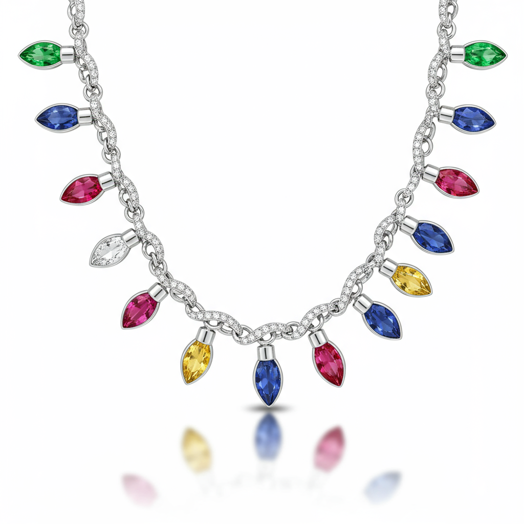 The Christmas Light Necklace captures the joyful spirit of the holidays in a dazzling array of precious gems. Exquisitely crafted in 18KT white gold, this delicate chain features a playful series of dangling 'lights,' each represented by a perfectly cut color stone accented with brilliant VVS diamonds. This piece offers a vibrant, sophisticated take on festive adornment, ideal for holiday galas or gifting. It is a stunning, joyful masterpiece designed to spread cheer and elegance throughout the season.