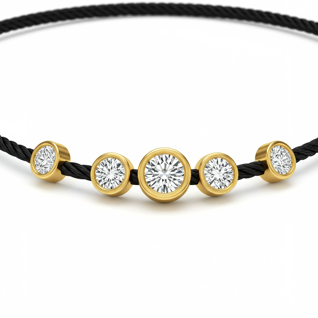 The Cord Necklace marries contemporary design with eternal luxury. Set in gleaming 18KT yellow gold, five delicate diamond stations float along a robust yet refined textile cord, creating an effortless statement. This piece offers versatile elegance, perfect for layering or wearing as a sophisticated solo accessory. Its adjustable length ensures a customized and flattering fit against the décolletage, blending modern style with fine jewelry craftsmanship.