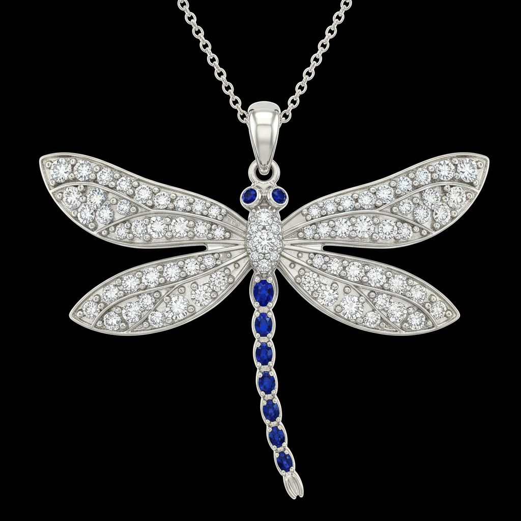 The Dragonfly Necklace is an exquisite tribute to nature's artistry, meticulously sculpted in luminous 18KT white gold. The graceful wings are entirely covered in brilliant pavé-set diamonds, capturing the light with every movement. Two stunning marquise sapphires form the delicate body, adding a vibrant focal point to the design. This luxurious pendant symbolizes transformation and elegance, making it a truly unique statement piece for any fine jewelry collection.