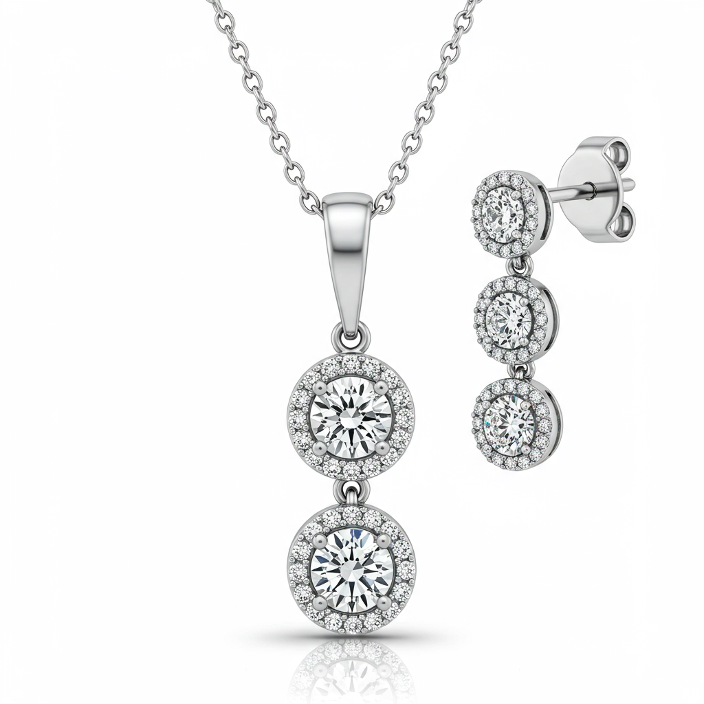 This exquisite Earring and Necklace Set embodies timeless elegance, crafted meticulously in luminous 18KT white gold. The coordinated design features brilliant central solitaire diamonds suspended within delicate halos of surrounding micro-pave stones. Each VVS diamond, exhibiting exceptional G color, catches the light with unparalleled fire and brilliance. This comprehensive set is the definitive statement piece for any sophisticated evening or celebratory occasion, offering perfect matching luxury.