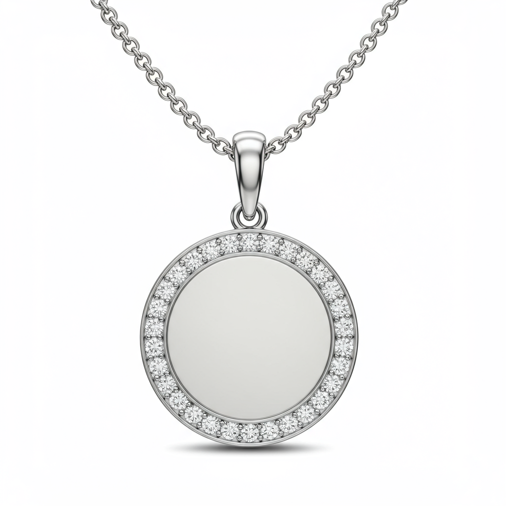 The Engraving Necklace Pandora offers a deeply personal luxury statement, meticulously crafted in radiant 18KT white gold. This customizable pendant features a polished circular disc, providing the perfect canvas for bespoke engraving, framed by a delicate halo of brilliant round diamonds. The high-polish finish reflects light beautifully, ensuring the piece catches the eye while maintaining sophisticated elegance. Suspended from a slender chain, this necklace transitions effortlessly from everyday wear to formal occasions, becoming a treasured heirloom.