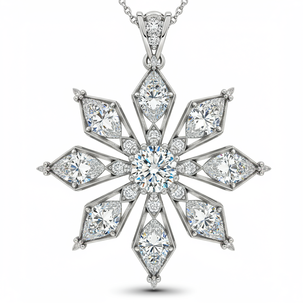 The Evenstar Arwen Necklace captures the ethereal beauty and enduring promise of Elvish craftsmanship. This iconic pendant is meticulously rendered in gleaming 18KT white gold, featuring an intricate seven-pointed star design. It is brilliantly illuminated by an array of VVS round and pear-cut diamonds, symbolizing the light of the evening star. A large, central marquise stone acts as the focal point, creating a breathtaking sparkle that rivals starlight. This piece is a timeless tribute to fantasy and eternal devotion.