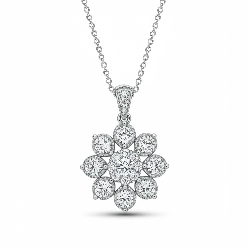 The Flower Necklace Hawaii captures the perpetual beauty of tropical blooms, crafted in lustrous 18KT white gold. This delicate design features a finely articulated floral motif, meticulously set with high-brilliance VVS diamonds. Suspended on an elegant chain, the pendant radiates natural sophistication and grace. It serves as a timeless emblem of luxury and exquisite craftsmanship, perfect for both daily wear and grand occasions.