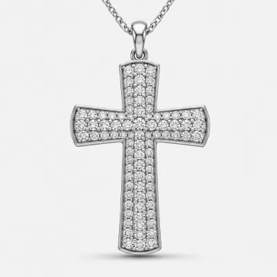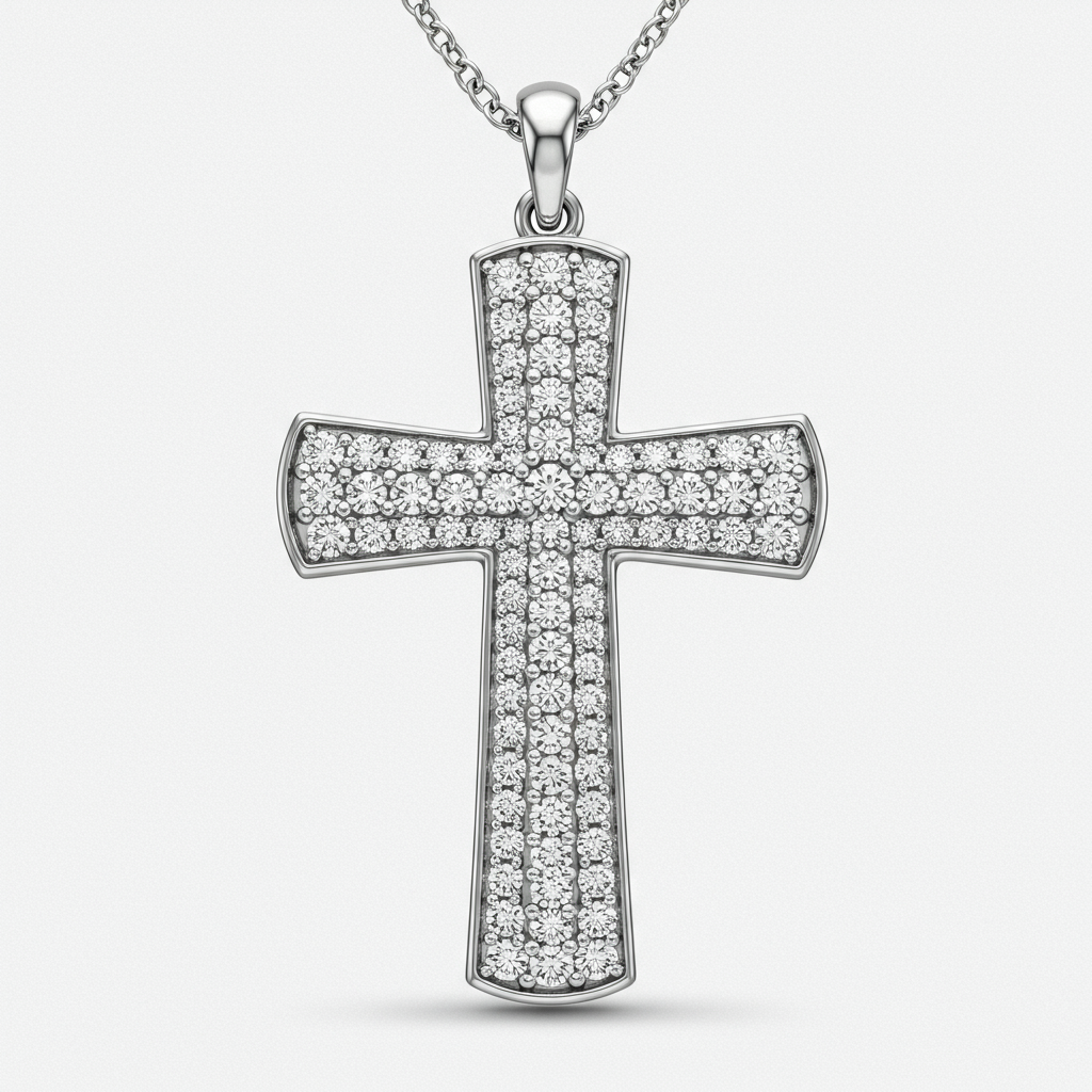 This divine Gold And Diamond Cross Necklace elegantly blends faith and high fashion. Crafted in radiant 18KT white gold, the sophisticated cross motif is fully illuminated by a precise pave setting of brilliant VVS diamonds. This timeless piece features exceptional craftsmanship, offering a luxurious sparkle perfect for daily wear or special occasions. It serves as a beautiful testament to enduring style and devotion.