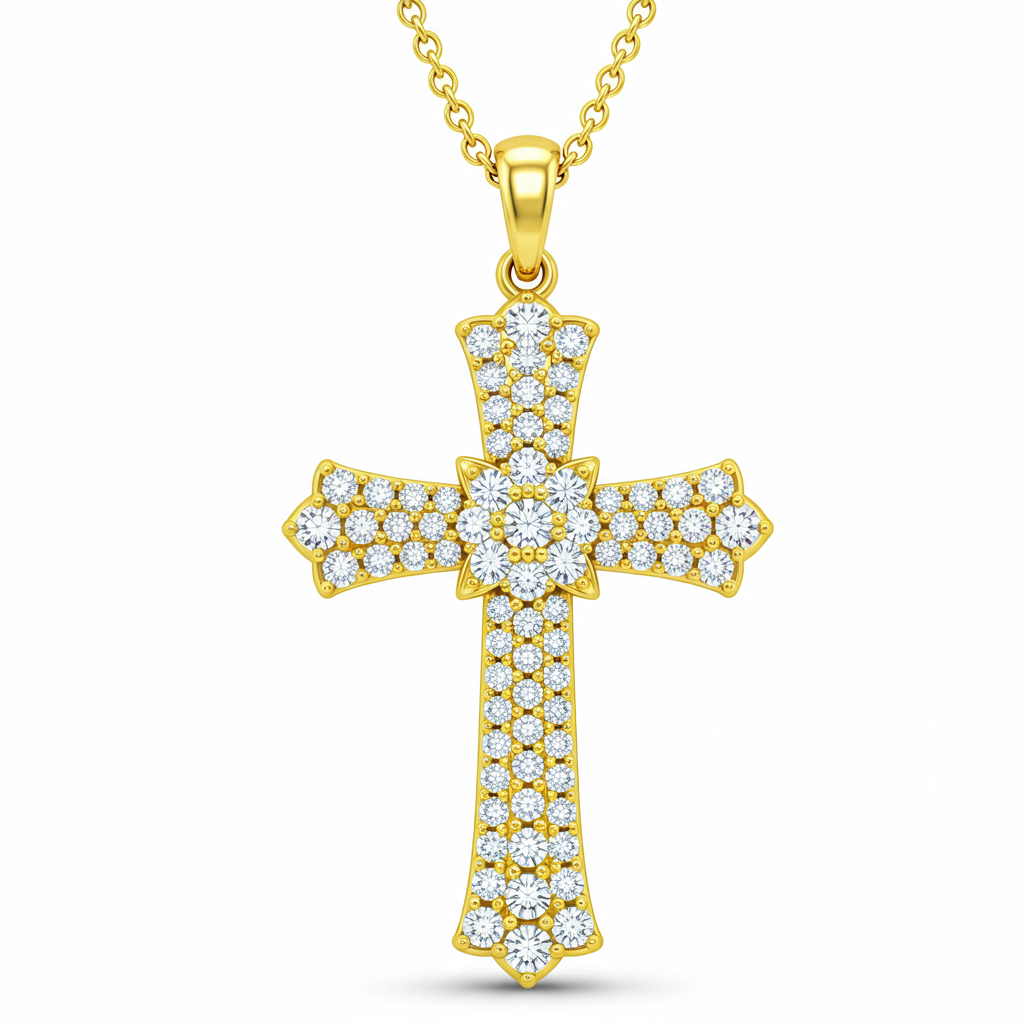 This exquisite Gold Diamond Cross Necklace symbolizes eternal faith and sophisticated elegance. Crafted in radiant 18KT yellow gold, the pendant features a delicate yet striking cross silhouette entirely paved with high-quality, brilliant round diamonds. The meticulous micro-pave setting maximizes light return, creating a breathtaking sparkle that catches the eye. Suspended from a fine gold chain, this piece serves as a luxurious statement of personal belief, perfect for daily wear or special occasions.