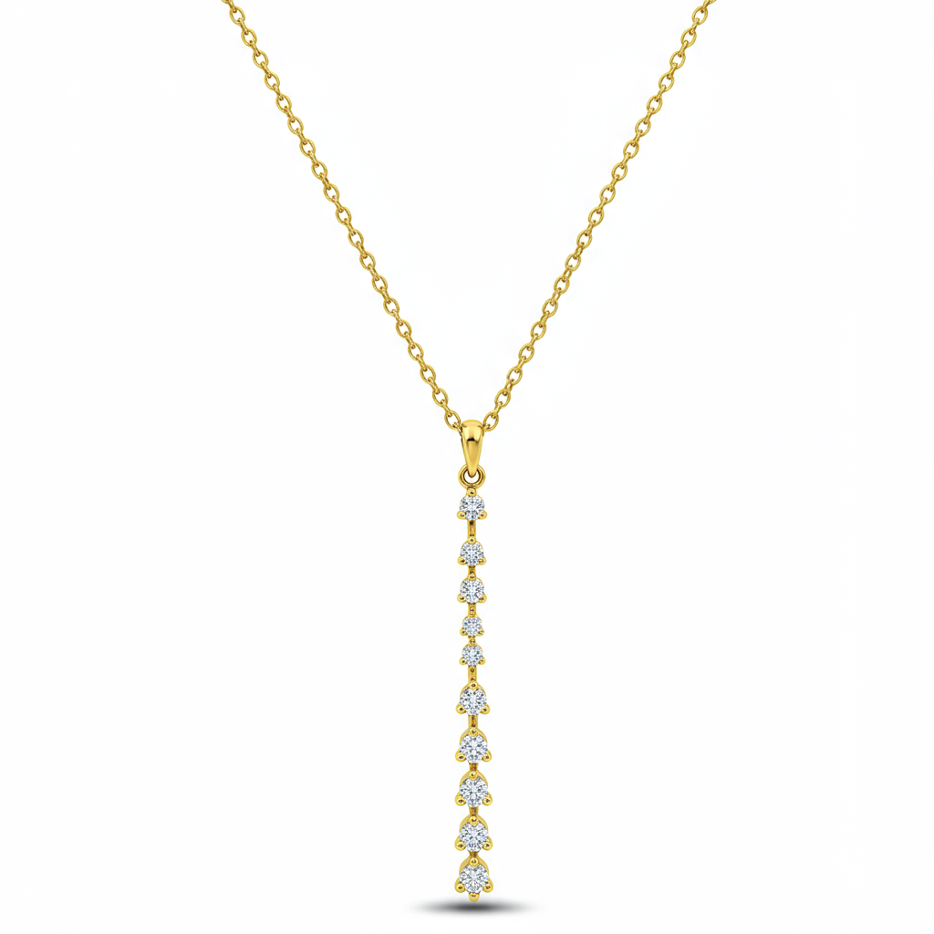 The Gold Lariat Necklace is an elegant statement of modern sophistication, designed to elongate the neckline with effortless grace. Crafted in radiant 18KT yellow gold, this piece features a fluid chain culminating in a dazzling diamond-set linear drop. The adjustable slide closure allows for versatile styling, creating a personalized look for any occasion. This necklace epitomizes refined luxury, making it an essential addition to a high-fashion jewelry collection.