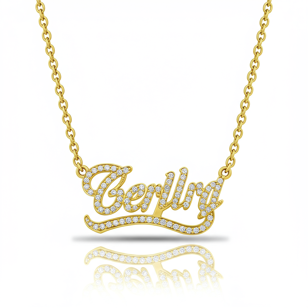 The Gold Plated Name Necklace offers a timeless statement of personal identity, expertly crafted with a durable 18KT gold plating over a solid metal core. This bespoke piece features highly polished script detailing, ensuring ultimate visibility and shine. Accented with dazzling pave-set VVS diamonds along the initial letters, the necklace captures light with every movement. Suspended from a delicate yet durable chain, this stunning piece is designed for daily wear and cherished longevity.