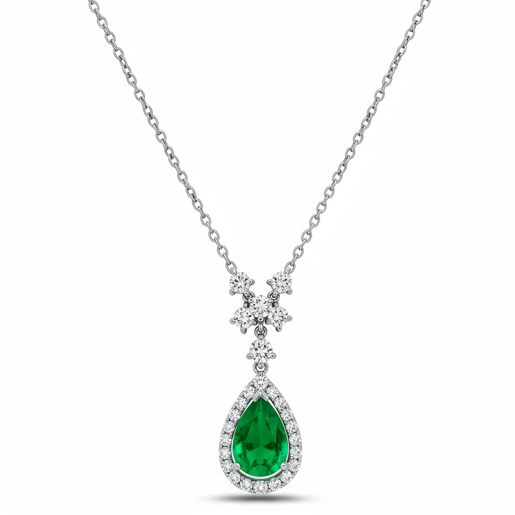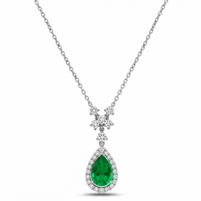 This exquisite Green Necklace features a captivating cascade of vibrant emeralds set against brilliant 18KT white gold. The central pear-cut emerald is framed by a dazzling halo of VVS round brilliant diamonds, enhancing its depth and fire. Crafted with precision, this piece embodies timeless elegance and sophisticated luxury. It is designed to drape gracefully around the neck, making a powerful statement for any grand occasion.