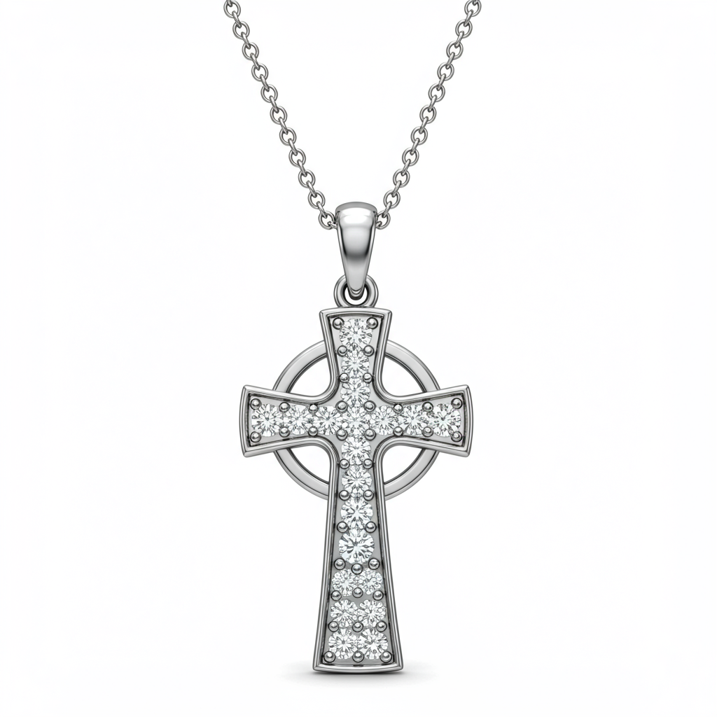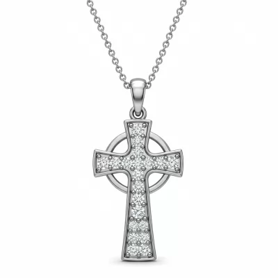 The Irish Cross Necklace masterfully blends ancient symbolism with contemporary elegance. Crafted in brilliant 18KT white gold, this pendant features a classic Celtic cross silhouette meticulously set with an array of dazzling, VVS round brilliant diamonds. The intricate pave setting captures and refracts light brilliantly, symbolizing eternal faith and heritage. Suspended from a delicate yet sturdy chain, this piece serves as a timeless emblem of culture and luxury, perfect for daily wear or special occasions.