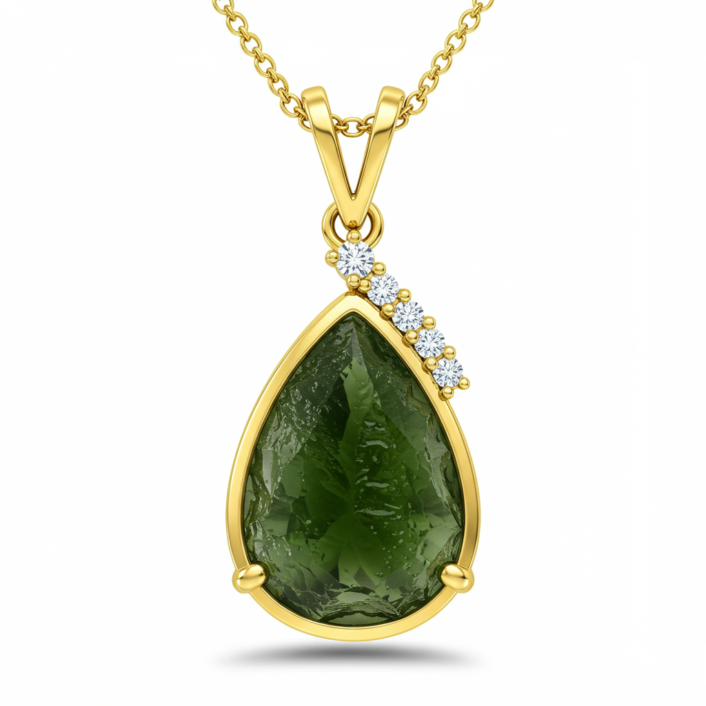 The Moldavite Solitaire Necklace captures the mystical energy of the cosmos in a truly timeless design. Featuring a genuine, naturally textured Moldavite, this mesmerizing pendant is suspended gracefully from an 18KT yellow gold bail accented with brilliant VVS diamonds. The sleek craftsmanship highlights the stone's unique green color and natural formation, making it a profound statement piece. This exquisite piece offers both sophistication and a deep, spiritual connection.