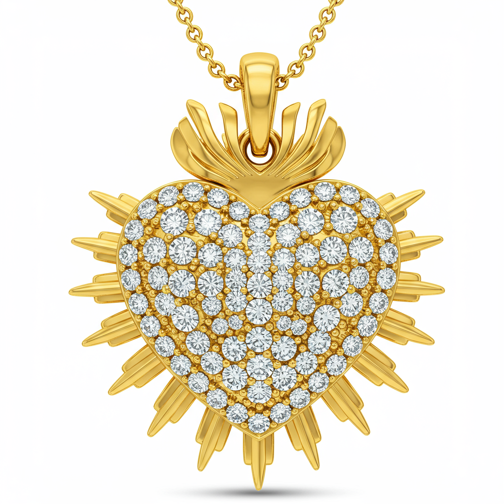 The Sacred Heart Necklace is an exquisite embodiment of devotion and eternal love, crafted from radiant 18KT yellow gold. This deeply symbolic pendant features the iconic flaming heart silhouette, intricately paved with brilliant VVS diamonds to maximize light performance. A masterful display of fine jewelry artistry, this piece serves as both a powerful personal talisman and a stunning statement of faith. It rests gracefully on a delicate, yet sturdy, matching gold chain, offering everyday luxury.