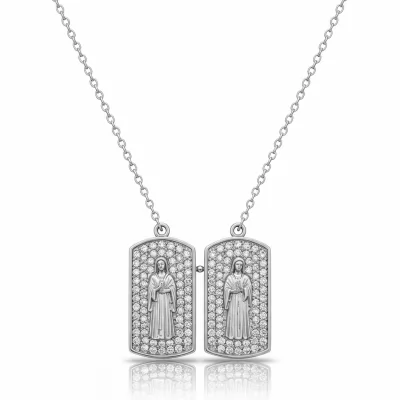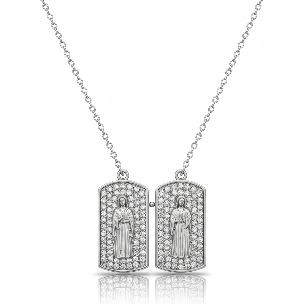 This exquisite scapular necklace reimagines a timeless devotional piece with contemporary luxury. Crafted in radiant 18KT white gold, the two delicate rectangular pendants are fully illuminated by micro-pave set VVS diamonds. Designed to rest gracefully on the collarbone, this necklace serves as a sophisticated symbol of faith and elegance. It is a stunning, modern heirloom perfect for daily wear or layering, offering brilliant sparkle and deep meaning.