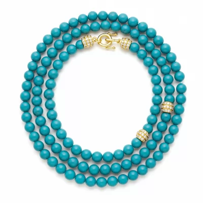 The turquoise beaded necklace is a testament to natural elegance, featuring perfectly spherical, highly saturated stones hand-strung for impeccable drape. Accented by an 18KT yellow gold clasp, this piece offers a brilliant contrast between the vibrant matrix of the turquoise and the warm glow of the metal. Each bead is meticulously selected, creating a harmonious color arrangement that captivates the eye. This heirloom-quality design transitions seamlessly from refined daywear to evening sophistication.