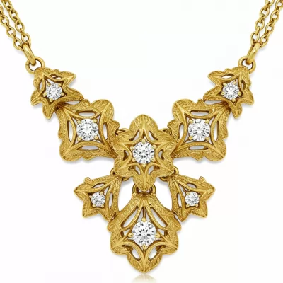 This exquisite vintage necklace captures the romance of a bygone era with its intricate filigree work and art-deco inspired silhouette. Crafted in radiant 18KT yellow gold, the design features delicate milgrain edges surrounding a stunning arrangement of premium diamonds. This piece is a true heirloom, offering unparalleled brilliance and sophisticated charm suitable for grand occasions. It serves as the perfect focal point for any luxury ensemble, radiating timeless elegance.