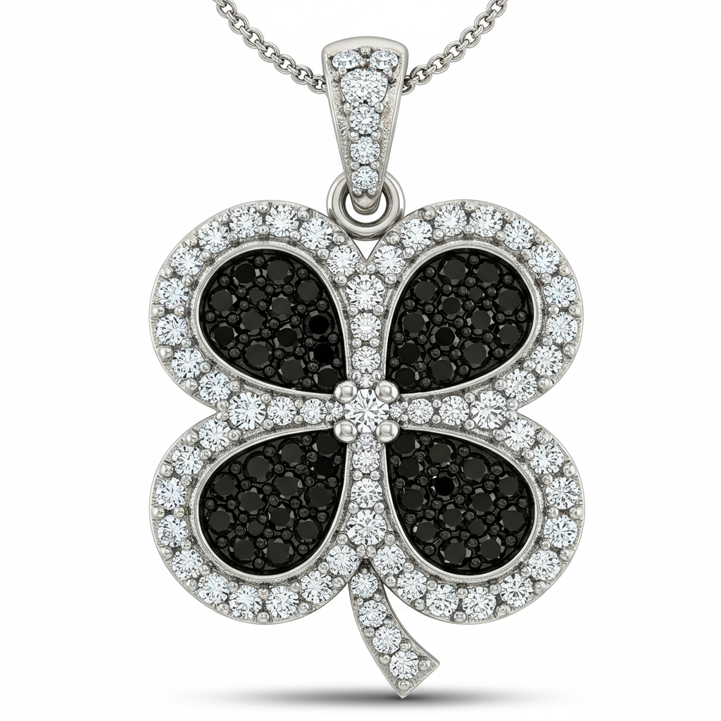 The Black Clover Necklace is an iconic piece blending timeless symbolism with modern elegance. Crafted in polished 18KT white gold, the four-leaf clover motif is meticulously outlined by brilliant white VVS diamonds, creating a stunning pavé border. The centerpiece features deep, mysterious black diamonds, offering a dramatic contrast that captures the light and eye. This pendant embodies luck and sophistication, suspended from a delicate yet sturdy chain perfect for everyday wear or glamorous evenings.