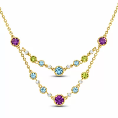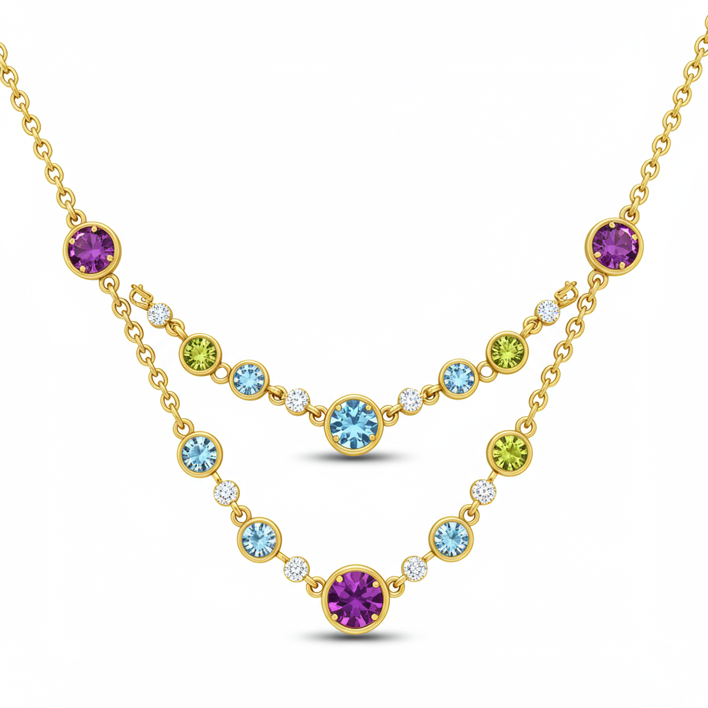 The 'candy necklaces' station necklace captures playful elegance, featuring a sequence of vibrant, bezel-set gemstones along a delicate 18KT yellow gold chain. Each station holds a different, brilliantly colored gem—Amethyst, Blue Topaz, and Peridot—alternating with fine VVS diamonds for added scintillation. This joyful piece offers versatile wearability, perfect for layering or as a stunning, standalone statement. It embodies modern luxury with a whimsical, irresistible charm that brightens any ensemble.