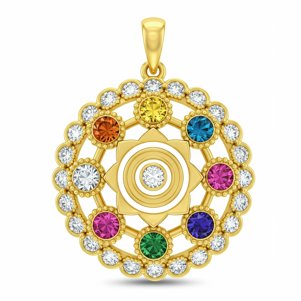 This exquisite Chakra Necklace is a masterpiece of spiritual luxury, meticulously crafted in radiant 18KT yellow gold. Seven vibrant, hand-selected gemstones representing the body's chakras are delicately arranged in a circular pattern, harmonizing energy and style. The central design is illuminated by pavé-set VVS diamonds, adding a celestial sparkle. This symbolic pendant is designed not only as a stunning statement piece but also as a powerful talisman for balance and well-being.