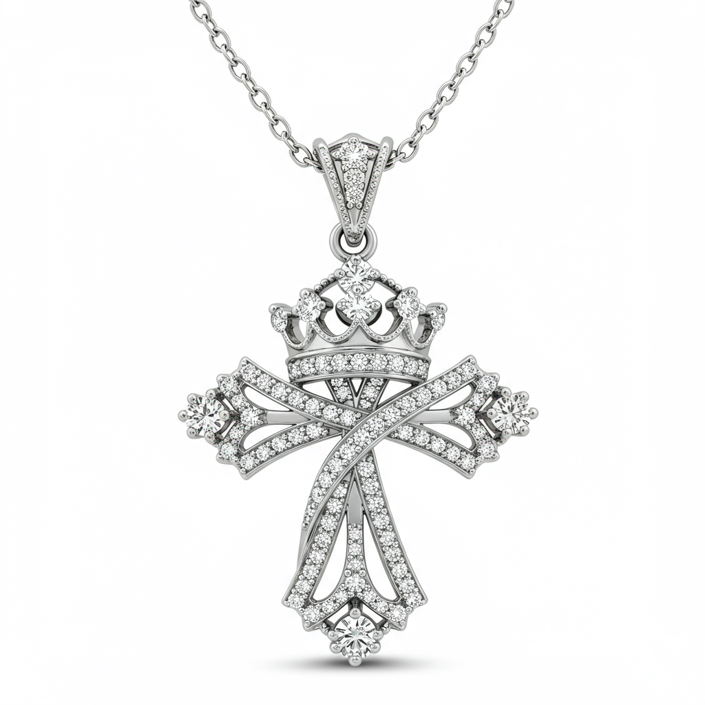 The Cross with Crown Necklace symbolizes faith and nobility, expertly crafted in luminous 18KT white gold. This striking pendant features an intricate cross adorned with a delicate, three-dimensional crown at its nexus. Brilliantly set VVS round diamonds illuminate every curve, providing unparalleled sparkle and depth. It is a timeless piece designed for those who appreciate meaningful jewelry with sophisticated design and exceptional craftsmanship.