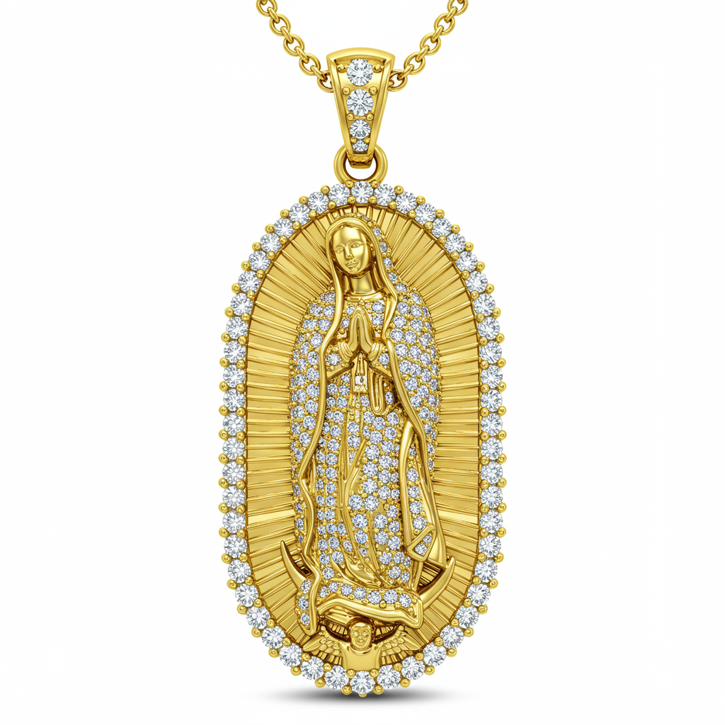 The Guadalupe Necklace is an exquisitely crafted symbol of enduring faith, featuring a delicate Virgin Mary pendant rendered in radiant 18KT yellow gold. The iconic silhouette is meticulously detailed and framed by a luminous halo of brilliant-cut VVS diamonds, emphasizing its spiritual significance. This heirloom piece blends traditional devotion with contemporary luxury, suspended from a matching polished gold chain. It serves as a profound statement of personal conviction and timeless elegance.