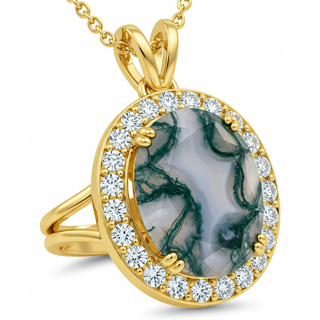 The Moss Agate Necklace captures the raw, untamed beauty of nature, featuring a deeply veined, polished moss agate centerpiece. Set securely in lustrous 18KT yellow gold, this solitaire pendant exudes organic elegance. The exquisite diamond halo surrounding the main stone adds a brilliant contrast, emphasizing the agate's unique inclusions. This piece is a perfect fusion of modern craftsmanship and earthly splendor, designed for the wearer who appreciates unique, botanical artistry and high-quality construction.