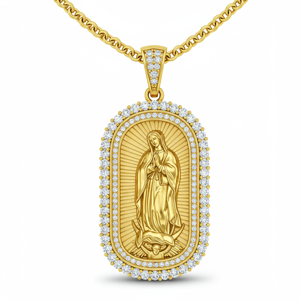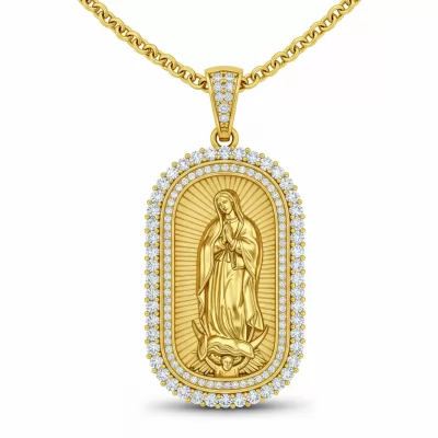 This exquisite Our Lady of Guadalupe necklace is a profound symbol of faith, meticulously crafted in radiant 18KT yellow gold. The detailed rendering of the revered image showcases exceptional artistry and precision craftsmanship. The surrounding halo is illuminated by brilliant VVS diamonds, catching light with every movement. This timeless piece serves as an elegant personal devotion, combining spiritual significance with a high jewelry aesthetic.