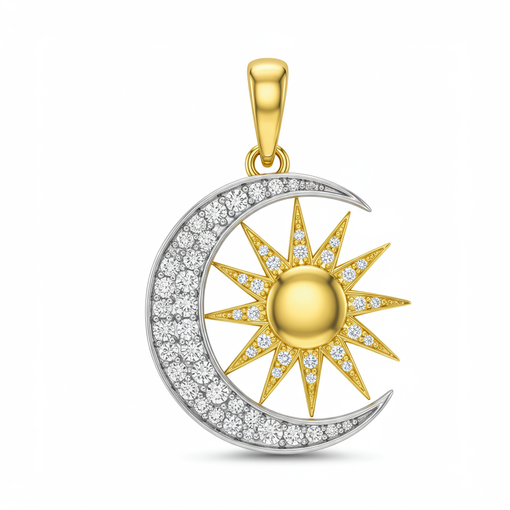 Embrace celestial elegance with this captivating Sun and Moon necklace, symbolizing eternal balance and duality. Crafted meticulously in 18KT dual-tone gold, the piece showcases a dazzling contrast between the sun's warm glow and the moon's cool luminosity. It is meticulously hand-set with high-quality VVS natural diamonds, offering unparalleled brilliance and fire. This heirloom-quality pendant makes a profound statement about harmony and everlasting connection.