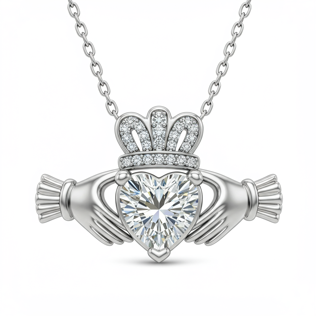 The Claddagh necklace symbolizes love, loyalty, and friendship, captured here in lustrous 18KT white gold. This iconic Irish design features a brilliant heart-shaped diamond held by hands and crowned with shimmering diamond accents. It is a timeless piece of jewelry, perfect for celebrating enduring devotion and heritage. Wear this pendant as a powerful token of connection and sophisticated elegance.