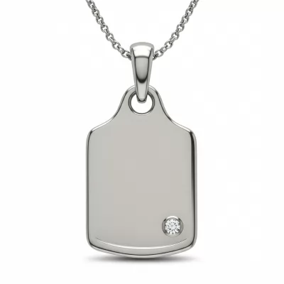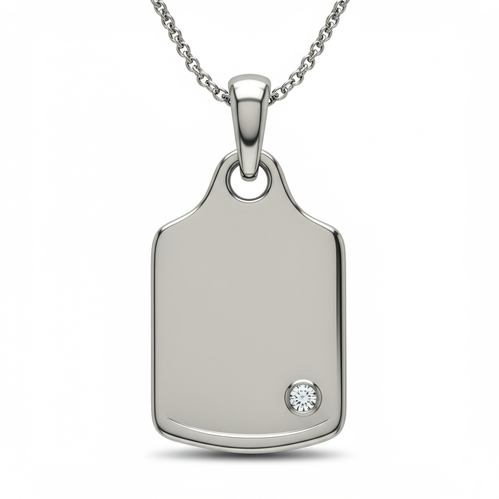 The Cow Tag Necklace is a bold statement piece, combining rustic inspiration with luxurious refinement. Crafted in gleaming 18KT white gold, the signature tag pendant is fully polished, offering an ideal surface for personalization or engraving. A single, bezel-set VVS diamond accents the bail, adding a refined sparkle to this distinctive contemporary design. This piece hangs elegantly from a delicate yet sturdy cable chain, making it perfect for daily wear or layering.