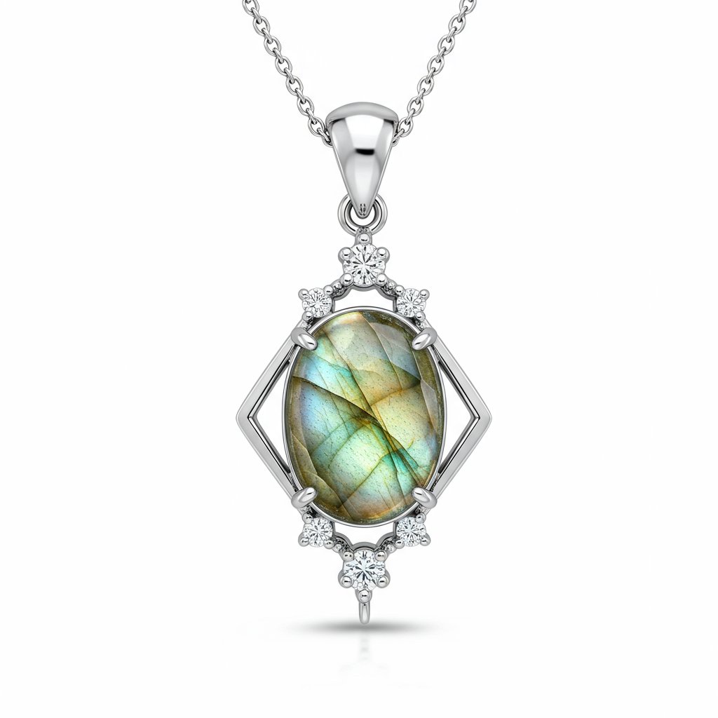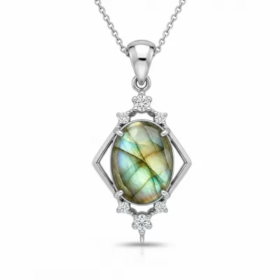 The Labradorite Glow Necklace captures the raw mystique of the northern lights in a wearable piece of high art. Set in shimmering 18KT white gold, the central, ethically sourced labradorite cabochon exhibits powerful spectral flashes of blue and green across its surface. This stunning 5.50ct focal point is elegantly framed by a halo of high-clarity VVS G diamonds. Suspended on a delicate chain, this pendant is designed for the modern connoisseur seeking unique brilliance and deep, natural sophistication.