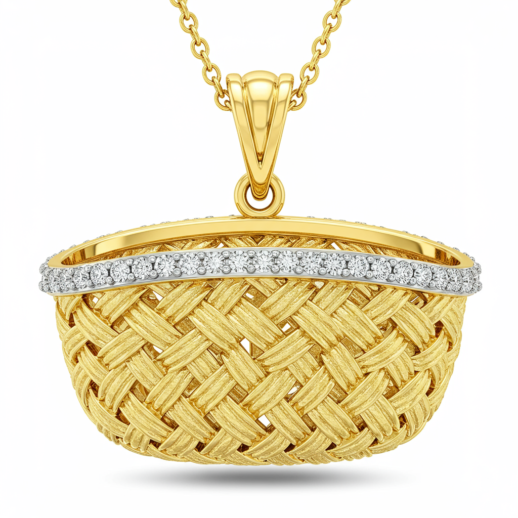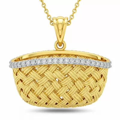 Inspired by the classic craftsmanship of Nantucket Island, this pendant elegantly captures the iconic basket weave design. Crafted in luminous 18KT gold, the miniature basket features a finely detailed texture, accented by brilliant micro-pave diamonds along the rim and bale. This piece serves as a sophisticated tribute to coastal elegance and timeless heritage, offering a unique charm for everyday wear.