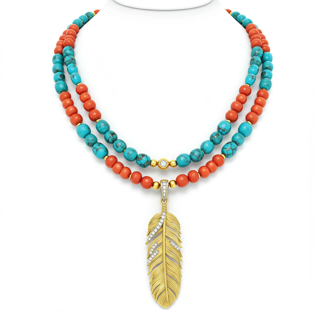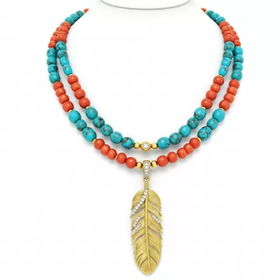 The Native Spirit Layered Necklace is a breathtaking modern homage to traditional Southwest jewelry, expertly crafted in 18KT yellow gold. This intricate design features multiple strands of polished turquoise and genuine coral beads, interspersed with brilliant diamond-set gold caps. The centerpiece pendant, shaped as a stylized feather, is meticulously micro-paved with VVS diamonds, reflecting unparalleled heritage and craftsmanship. This statement piece brings a touch of powerful, timeless elegance to any luxury collection.