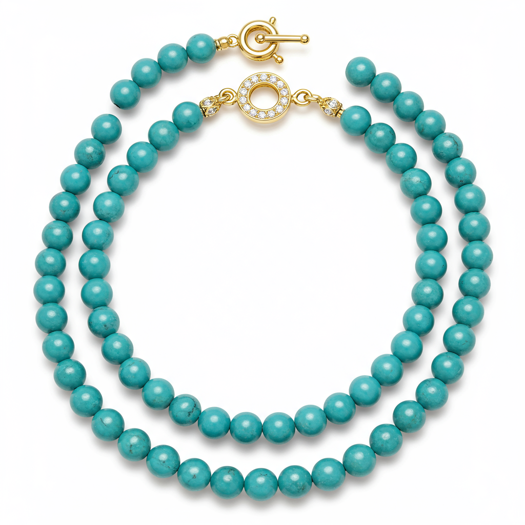 This exquisite beaded necklace features uniformly sized, polished genuine Turquoise beads, capturing the essence of oceanic serenity. Each bead is meticulously strung and secured by an elegant 18KT yellow gold clasp. The design is timeless, offering a vibrant pop of natural color that transitions effortlessly from daywear to evening sophistication. This piece serves as a striking statement, whether worn alone or layered with other fine chains. It embodies natural beauty and luxurious craftsmanship.