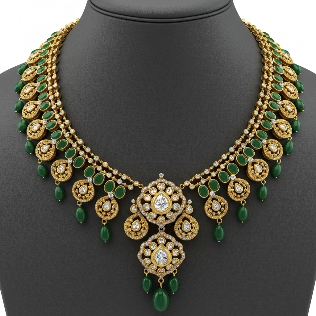 A magnificent 18KT yellow gold traditional Kundan necklace, showcasing intricate craftsmanship. This piece features large, foil-backed green Kundan stones set in a majestic pattern, complemented by brilliant VVS round diamonds that highlight the detailed borders. Elegant white cultured pearls drop gracefully along the base, lending a timeless regal appeal. This heirloom-quality necklace is designed for grand occasions, embodying the splendor of Indian heritage jewelry.