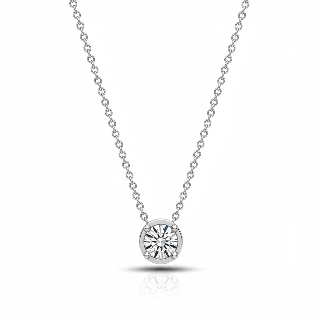 The Invisible Necklace is meticulously designed to celebrate the brilliance of the diamond, making the setting virtually disappear. A single, magnificent brilliant-cut diamond of superior VVS clarity appears to float effortlessly against the skin, catching every ray of light with breathtaking intensity. Crafted in luminous 18KT white gold, this piece embodies minimalist luxury and timeless elegance. It is the perfect subtle statement for sophisticated daily wear or chic layering with other delicate necklaces.