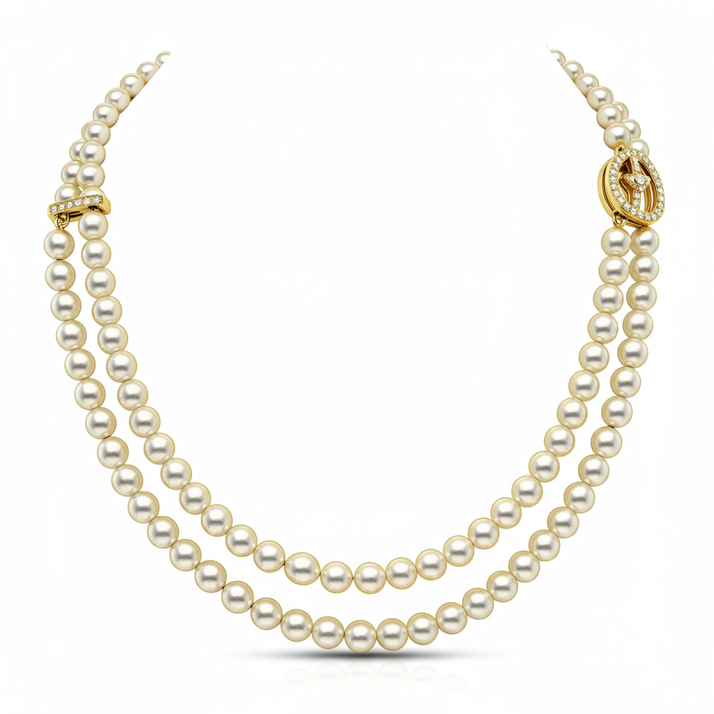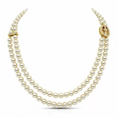 Embrace sophistication with this luxurious layered pearl necklace, featuring two cascading strands of luminous freshwater pearls. The design is meticulously crafted in 18KT yellow gold, offering a warm and timeless appeal. Delicate micro-pave diamond accents, graded VVS clarity, adorn the secure hidden clasp, adding a subtle sparkle. This versatile piece effortlessly transitions from elegant daytime wear to glamorous evening attire, making it a true staple of fine jewelry.