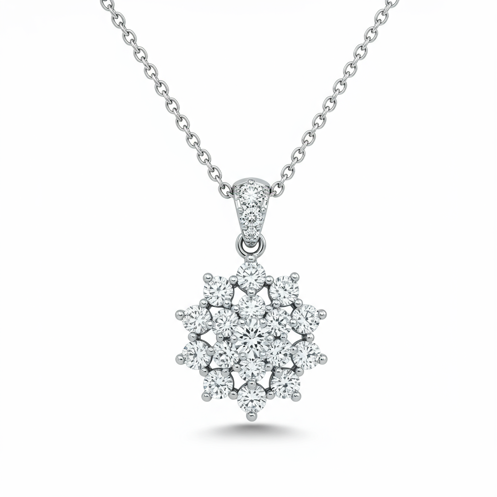 The Garden Necklace captures the delicate beauty of a blooming floral cluster, meticulously set with brilliant diamonds. Crafted in luxurious 18KT white gold, the central motif showcases a breathtaking arrangement of VVS diamonds, creating unparalleled fire and brilliance. This elegant pendant hangs from a fine trace chain, offering a stunning silhouette perfect for both daily sophistication and evening glamour. It is a timeless piece designed to evoke nature's artistry and eternal grace.